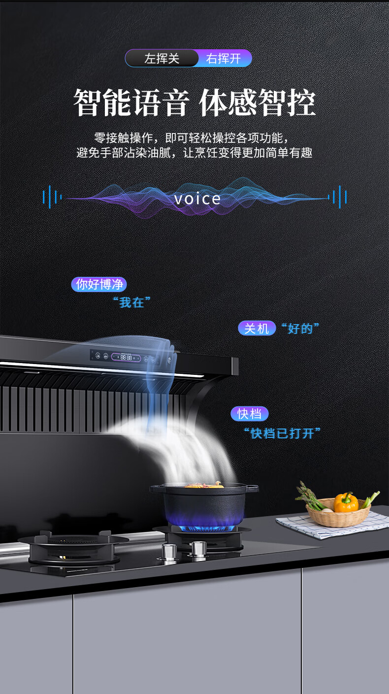 智能體感開關(guān),頭部恒溫置物臺(tái),防油污冷凝板,一鍵自動(dòng)清洗,七色氛圍燈隨意切換,下廚也能多姿多彩。簡(jiǎn)約純凈,經(jīng)典酷黑,與櫥柜和諧統(tǒng)一!無論搭配黑灰色還是原木色櫥柜,都能呈現(xiàn)出和諧的視覺感,豐富空間層次之余,又在顏值上美出新高度。智能觸控、智慧生活,超大液晶屏,開啟智能烹飪。即使一個(gè)人下廚也可以閑庭信步,樂享智能生活。