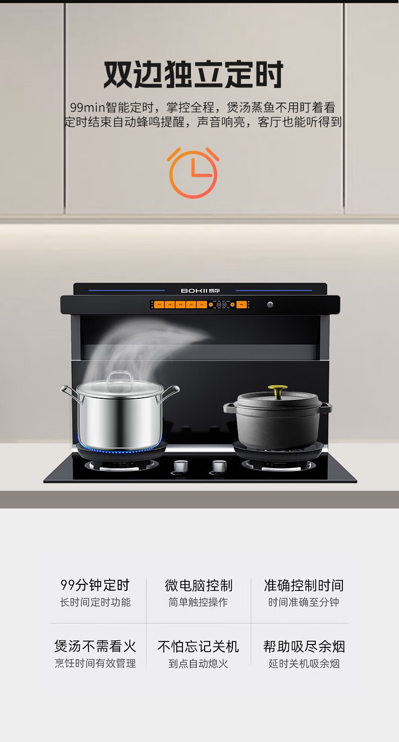 博凈分體式集成灶采用側(cè)吸下排的設(shè)計(jì),能在油煙產(chǎn)生的瞬間將其吸走,吸煙率高達(dá)99.6%以上,徹底告別油煙困擾。這對于熱愛烹飪卻害怕油煙的年輕人來說,無疑是莫大的福音。它不僅功能強(qiáng)大,還融入了智能科技。如智能語音體感操控、觸控面板、定時(shí)功能、智能防火墻等,讓烹飪變得更加簡單便捷。對于追求高效、便捷生活的年輕人來說,這樣的設(shè)計(jì)無疑大大提升了烹飪體驗(yàn)。