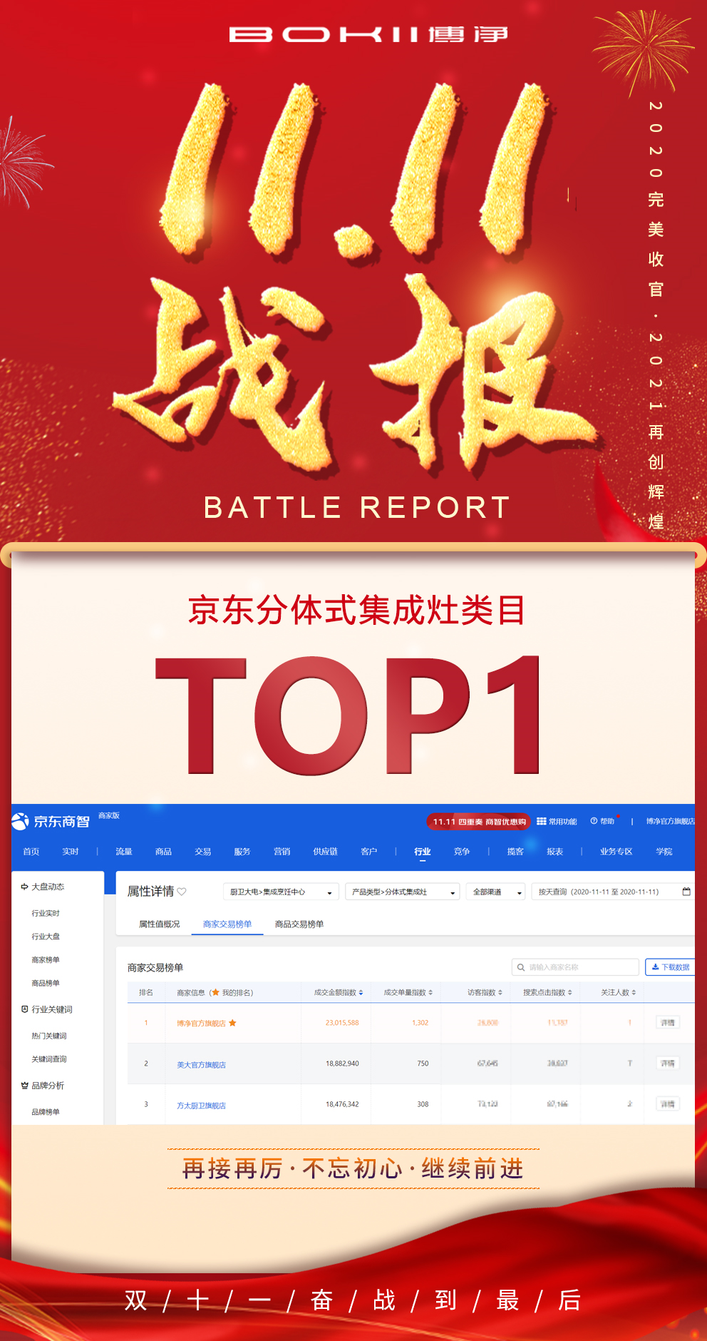 雙11大戰(zhàn)已經(jīng)完美落幕,在這場萬眾矚目的消費盛宴中,博凈電器力壓群雄,在京東分體式集成灶類目里斬獲成交金額、總銷量均TOP1的喜人成績。這個雙十一驕人戰(zhàn)績,無疑展現(xiàn)了博凈分體式集成灶...